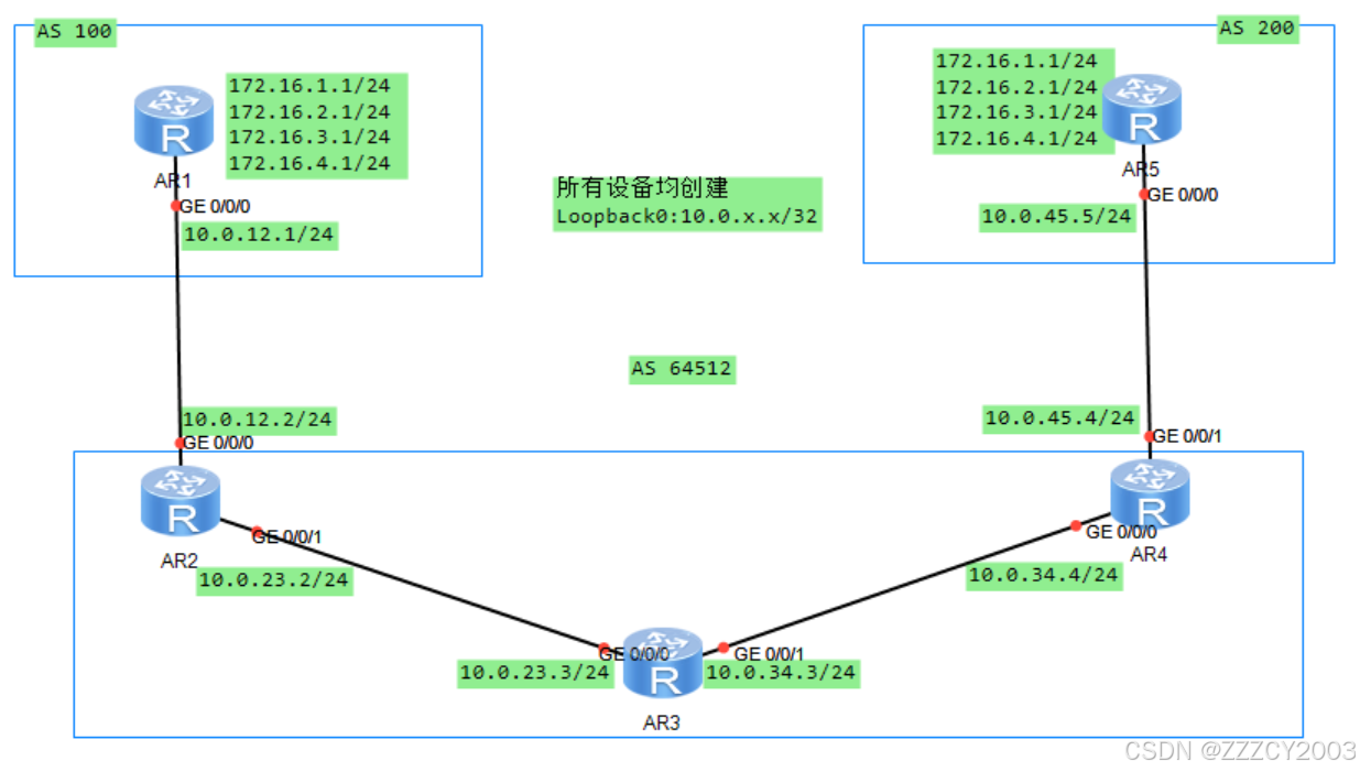 EBGP对等体关系基于直连接口建立,IBGP对等体关系基于Loopback 0接口建立。在AR1、AR5上存在相同的网段172.16.1.0/24、172.16.2.0/24、172.16.3.0/24、172.16.4.0/24,在AR1、AR5上将其发布到BGP,以用于BGP路由优选