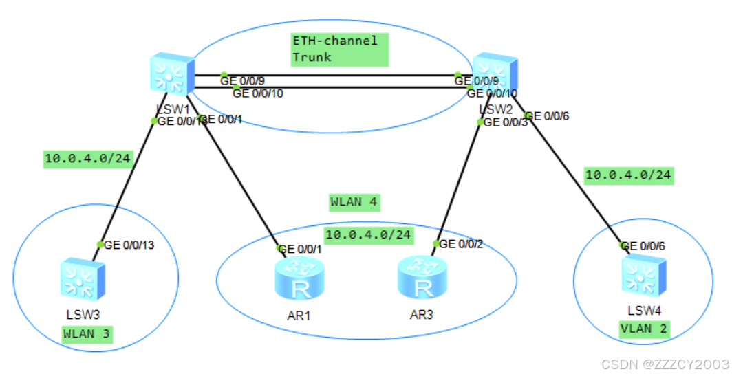 展开代码# AR1配置 [AR1]interface GigabitEthernet 0/0/1 [AR1-GigabitEthernet0/0/1]ip address 10.0.4.1 24 [AR1-GigabitEthernet0/0/1]q [AR1] # LSW3配置 [LSW3]interface Vlanif 1 [LSW3-Vlanif1]ip address 10.0.4.2 24 [LSW3-Vlanif1]q [LSW3] # LSW4配置 [LSW4]interface Vlanif 1 [LSW4-Vlanif1]ip address 10.0.4.4 24 [LSW4-Vlanif1]q [LSW4] # AR3配置 [AR3]interface GigabitEthernet 0/0/2 [AR3-GigabitEthernet0/0/2]ip address 10.0.4.3 24 [AR3-GigabitEthernet0/0/2]q [AR3]