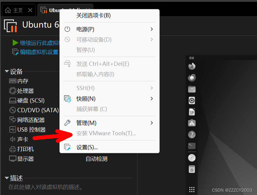右键点击你的虚拟机,在菜单中找到安装 VMware Tools(T),如下图:
