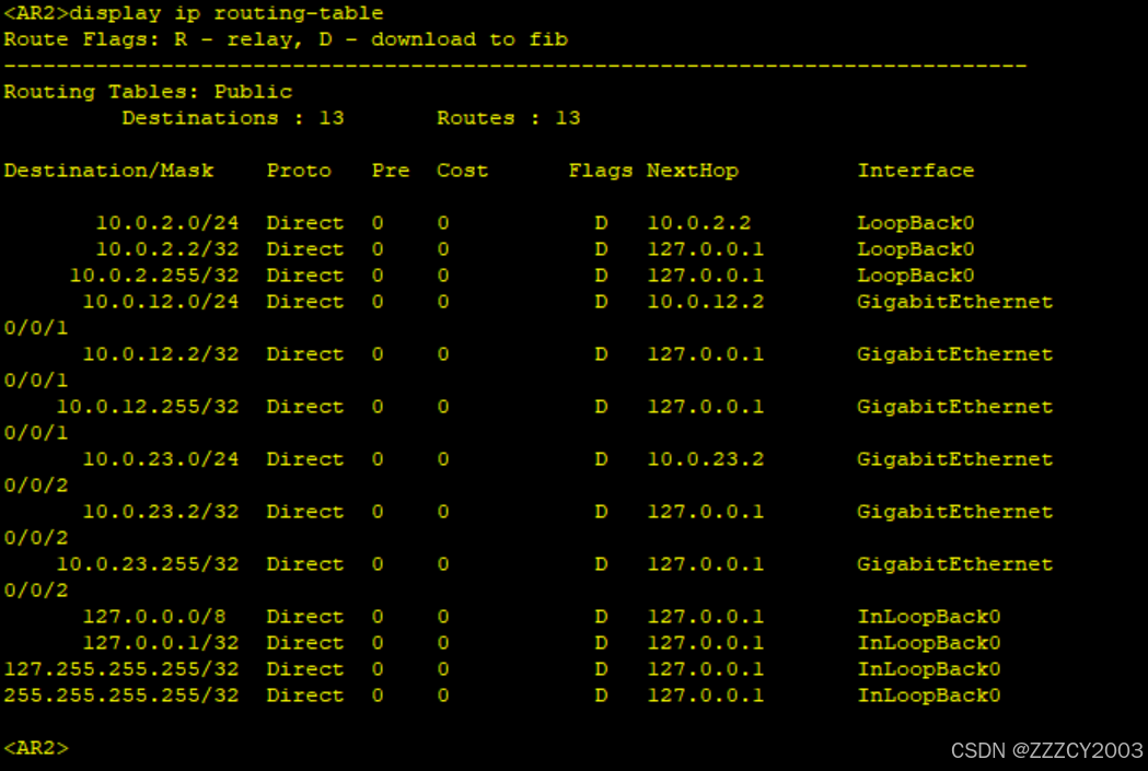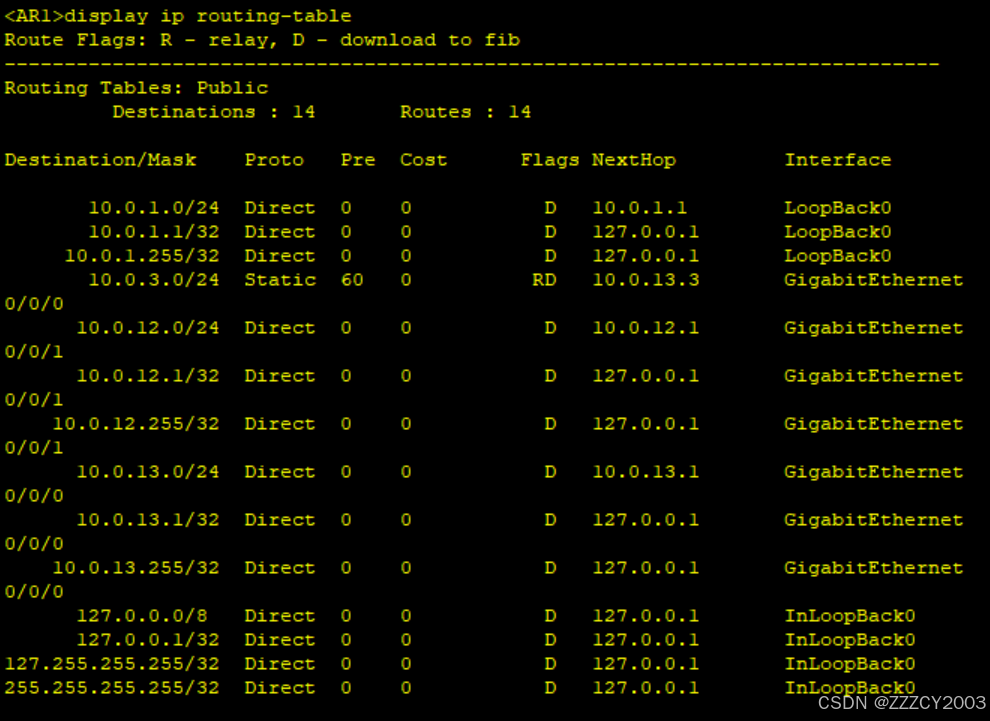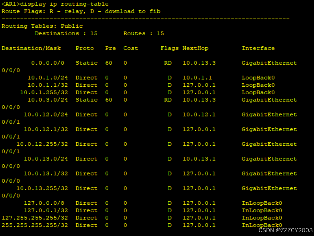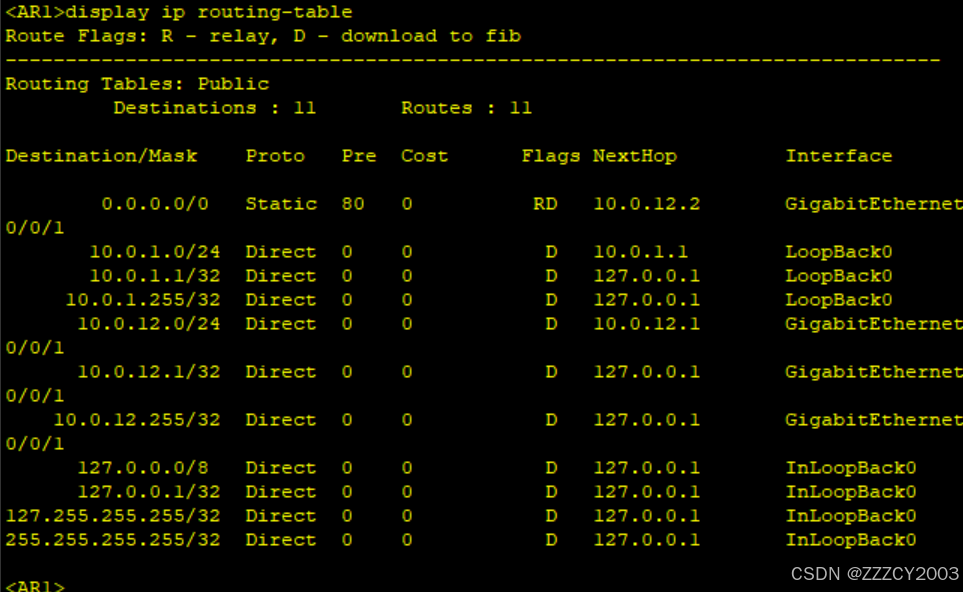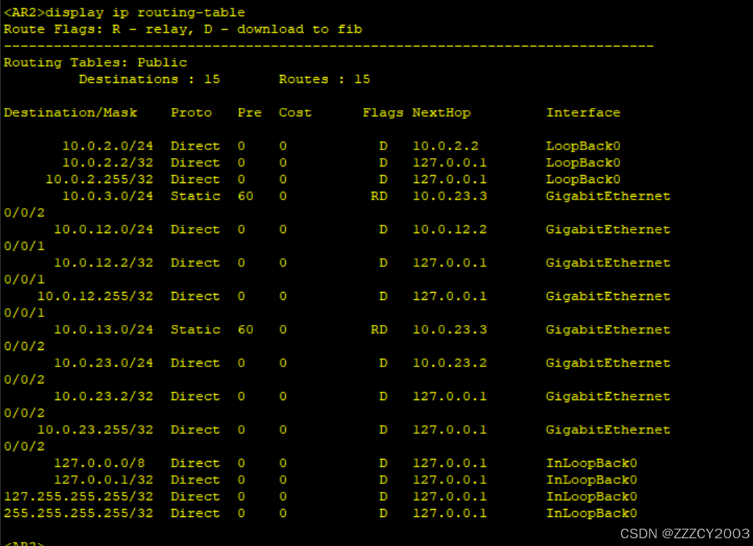 AR1通过缺省路由实现了与网段10.0.23.0间的通信
