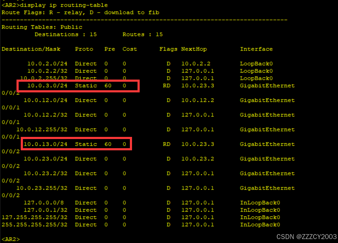 配置目的地址为10.0.13.0/24和10.0.3.0/24的静态路由,路由的下一跳配置为AR3的G0/0/0接口IP地址10.0.23.3.默认静态路由的优先级为60,无需额外配置路由优先级信息