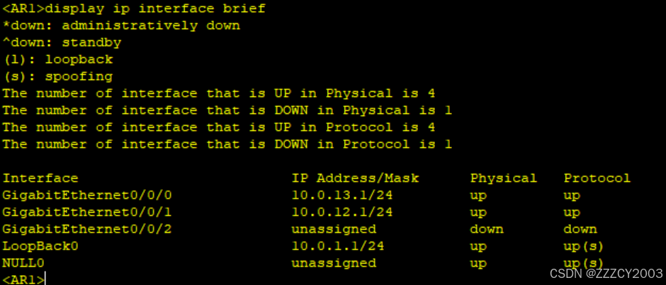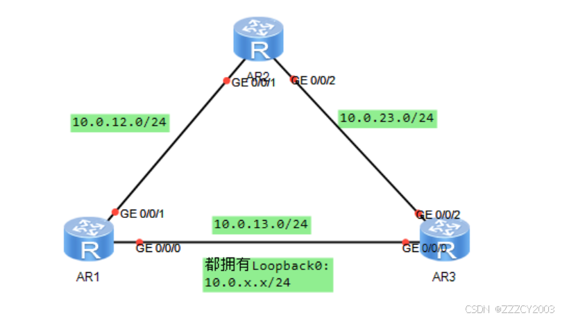 展开代码# AR1配置 [AR1]interface GigabitEthernet 0/0/0 [AR1-GigabitEthernet0/0/0]ip address 10.0.13.1 24 [AR1-GigabitEthernet0/0/0]q [AR1]interface GigabitEthernet 0/0/1 [AR1-GigabitEthernet0/0/1]ip address 10.0.12.1 24 [AR1-GigabitEthernet0/0/1]q [AR1]interface LoopBack 0 [AR1-LoopBack0]ip address 10.0.1.1 24 [AR1-LoopBack0]q [AR1] # AR2配置 [AR2]interface GigabitEthernet 0/0/1 [AR2-GigabitEthernet0/0/1]ip address 10.0.12.2 24 [AR2-GigabitEthernet0/0/1]q [AR2]interface GigabitEthernet 0/0/2 [AR2-GigabitEthernet0/0/2]ip address 10.0.23.2 24 [AR2-GigabitEthernet0/0/2]q [AR2]interface LoopBack 0 [AR2-LoopBack0]ip address 10.0.2.2 24 [AR2-LoopBack0]q [AR2] # AR3配置 [AR3]interface GigabitEthernet 0/0/0 [AR3-GigabitEthernet0/0/0]ip address 10.0.13.3 24 [AR3-GigabitEthernet0/0/0]q [AR3]interface GigabitEthernet 0/0/2 [AR3-GigabitEthernet0/0/2]ip address 10.0.23.3 24 [AR3-GigabitEthernet0/0/2]q [AR3]interface LoopBack 0 [AR3-LoopBack0]ip address 10.0.3.3 24 [AR3-LoopBack0]q [AR3]