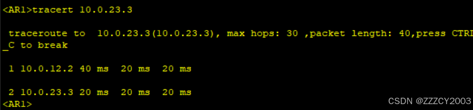 网络并没有因为AR1和AR3之间的链路被关闭而中断。执行tracert命令,查看数据包的转发路径