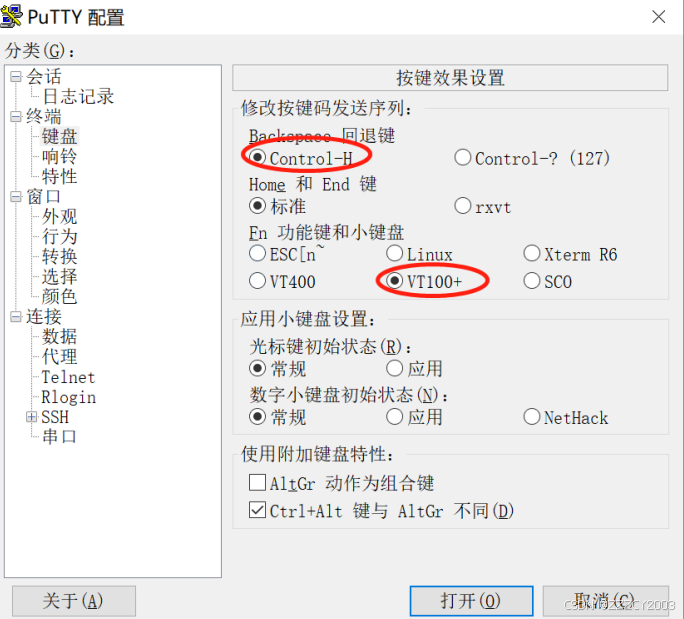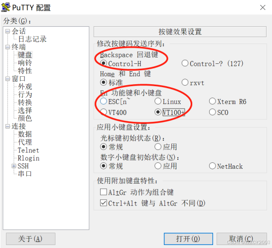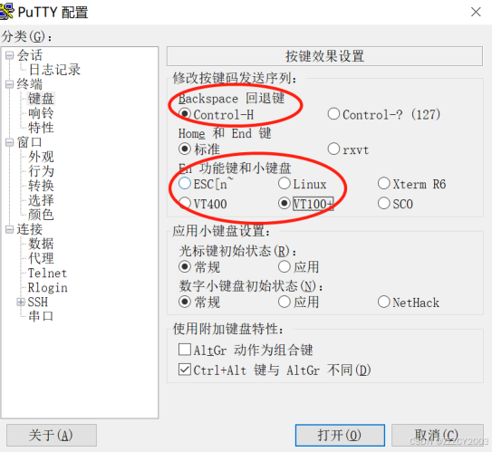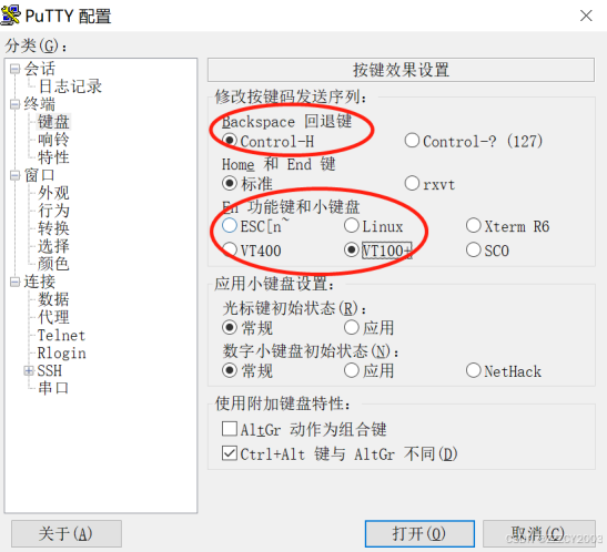 远程维护终端上打开第三方软件(如 PuTTY),进行键盘设置和会话设置。在进行键盘设 置时,“Backspace”回退键选择“Control-H”,“Fn 功能键和小键盘”选择“VT100+”