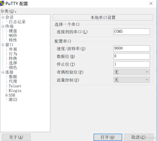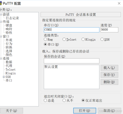 在 PC 上打开终端仿真软件,新建连接,设置连接的接口以及通信参数。(以第三方 软件 PuTTY 为例)