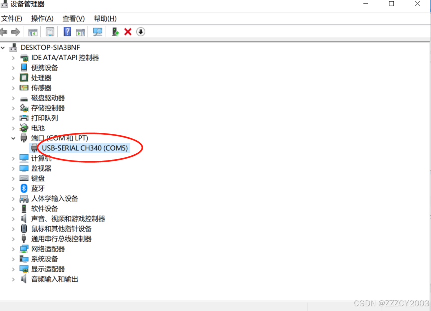 在 PC 上选择“我的电脑”,按“右键”选择“属性”,打开设备管理器,查看“端口”选项, 确认电脑串口名称