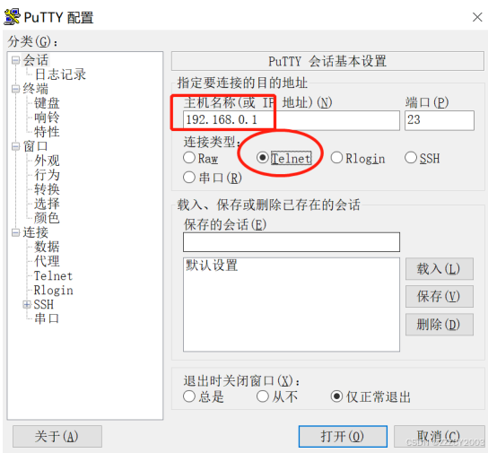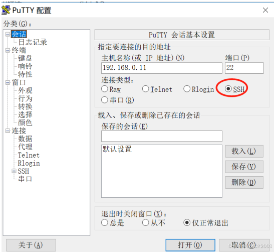 通过 putty 软件登录设备,输入设备的 IP 地址,选择协议类型为 SSH,设置键盘参数