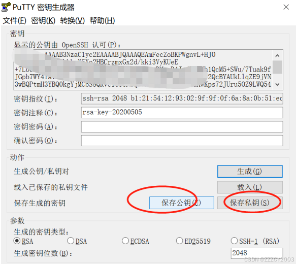 密钥生成后如上图所示,点击“保存公钥”,文件名为“public.pub”。然后再点击“保存 私钥”,在弹出的对话框中,选择“是”,保存文件名为“private.ppk”