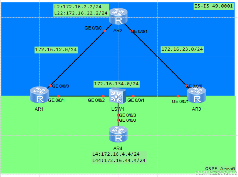 展开代码# AR1配置 [AR1]interface GigabitEthernet 0/0/0 [AR1-GigabitEthernet0/0/0]ip address 172.16.12.1 255.255.255.0 [AR1-GigabitEthernet0/0/0]q [AR1]interface GigabitEthernet 0/0/1 [AR1-GigabitEthernet0/0/1]ip address 172.16.134.1 24 [AR1-GigabitEthernet0/0/1]q [AR1] # AR2配置 [AR2]interface LoopBack 2 [AR2-LoopBack2]ip address 172.16.2.2 24 [AR2-LoopBack2]q [AR2]interface LoopBack 22 [AR2-LoopBack22]ip address 172.16.22.2 24 [AR2-LoopBack22]q [AR2]interface GigabitEthernet 0/0/0 [AR2-GigabitEthernet0/0/0]ip address 172.16.12.2 24 [AR2-GigabitEthernet0/0/0]q [AR2]interface GigabitEthernet 0/0/1 [AR2-GigabitEthernet0/0/1]ip address 172.16.23.2 24 [AR2-GigabitEthernet0/0/1]q [AR2] # AR3配置 [AR3]interface GigabitEthernet 0/0/0 [AR3-GigabitEthernet0/0/0]ip address 172.16.23.3 24 [AR3-GigabitEthernet0/0/0]q [AR3]interface GigabitEthernet 0/0/1 [AR3-GigabitEthernet0/0/1]ip address 172.16.134.3 24 [AR3-GigabitEthernet0/0/1]q [AR3] # AR4配置 [AR4]interface GigabitEthernet 0/0/0 [AR4-GigabitEthernet0/0/0]ip address 172.16.134.4 24 [AR4-GigabitEthernet0/0/0]q [AR4]interface LoopBack 4 [AR4-LoopBack4]ip address 172.16.4.4 24 [AR4-LoopBack4]q [AR4]interface LoopBack 44 [AR4-LoopBack44]ip address 172.16.44.4 24 [AR4-LoopBack44]q [AR4]