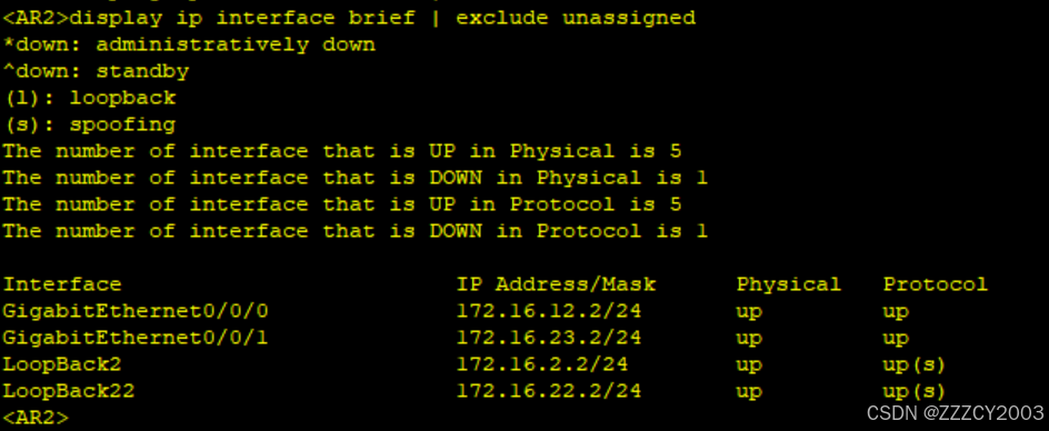 展开代码<AR2>display ip interface brief | exclude unassigned