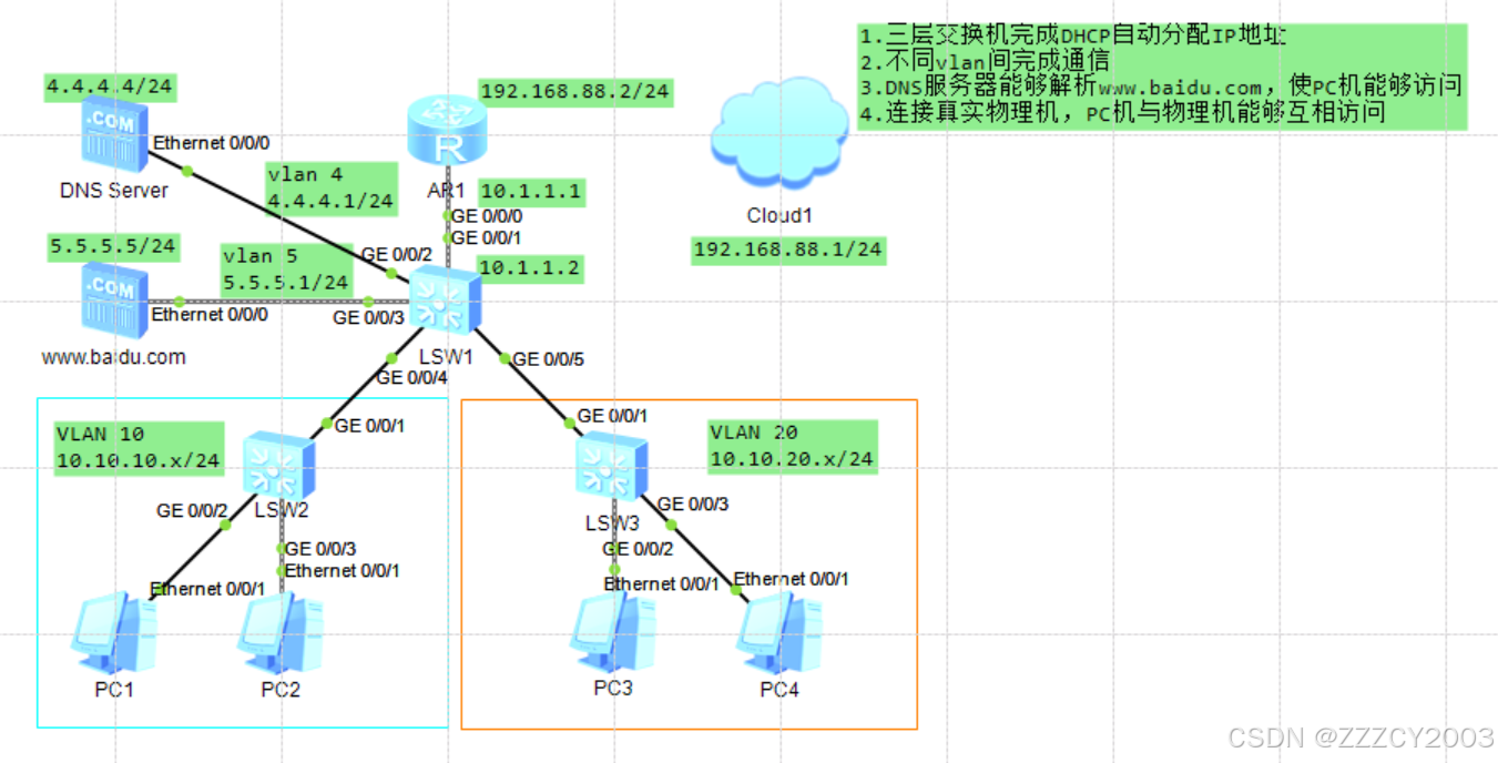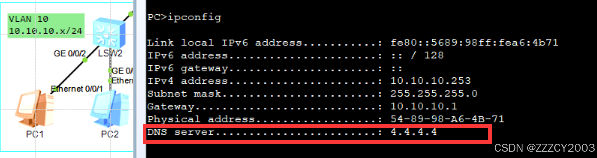 LSW1需要创建两个VLAN分别作为两个服务器的网关,同时需要在DHCP的地址池上增加DNS服务器的IP地址(配置好,最好重新启动一个PC机让它重新获取IP地址,才能出现DNS服务器地址)