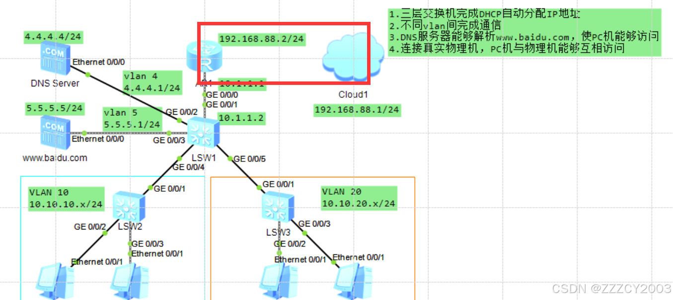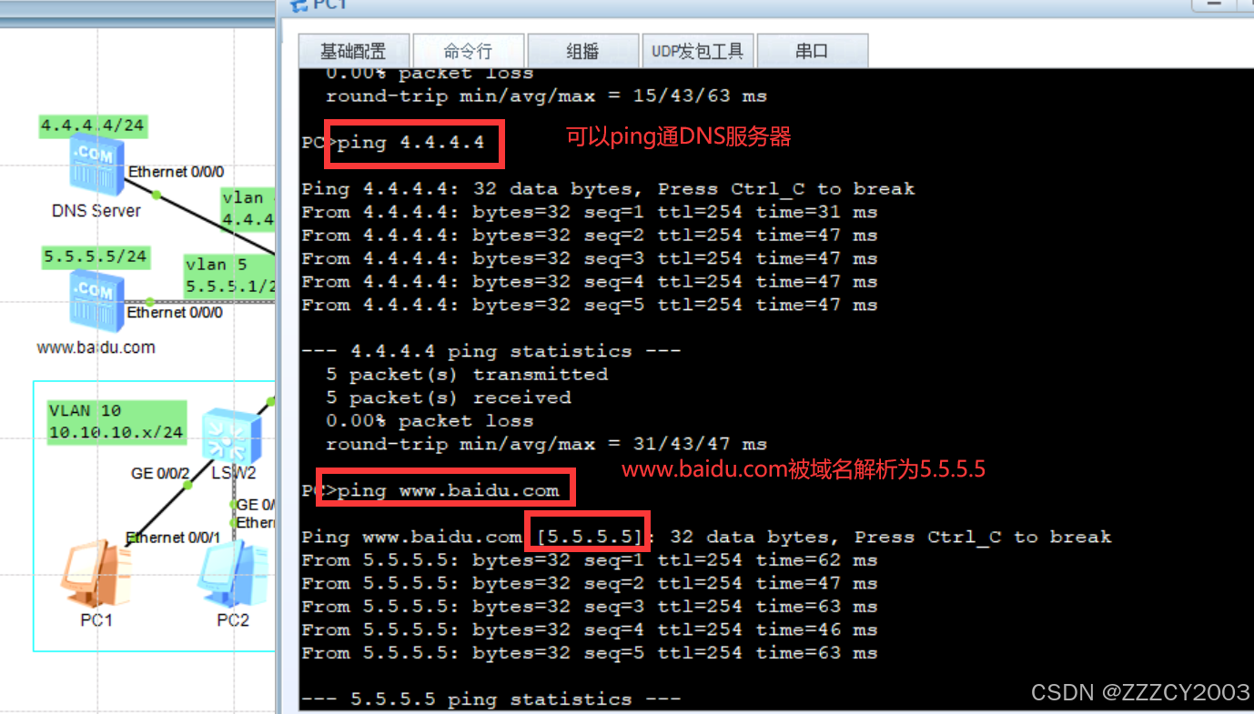 - DNS服务器能够解析www.baidu.com,使PC机能够访问