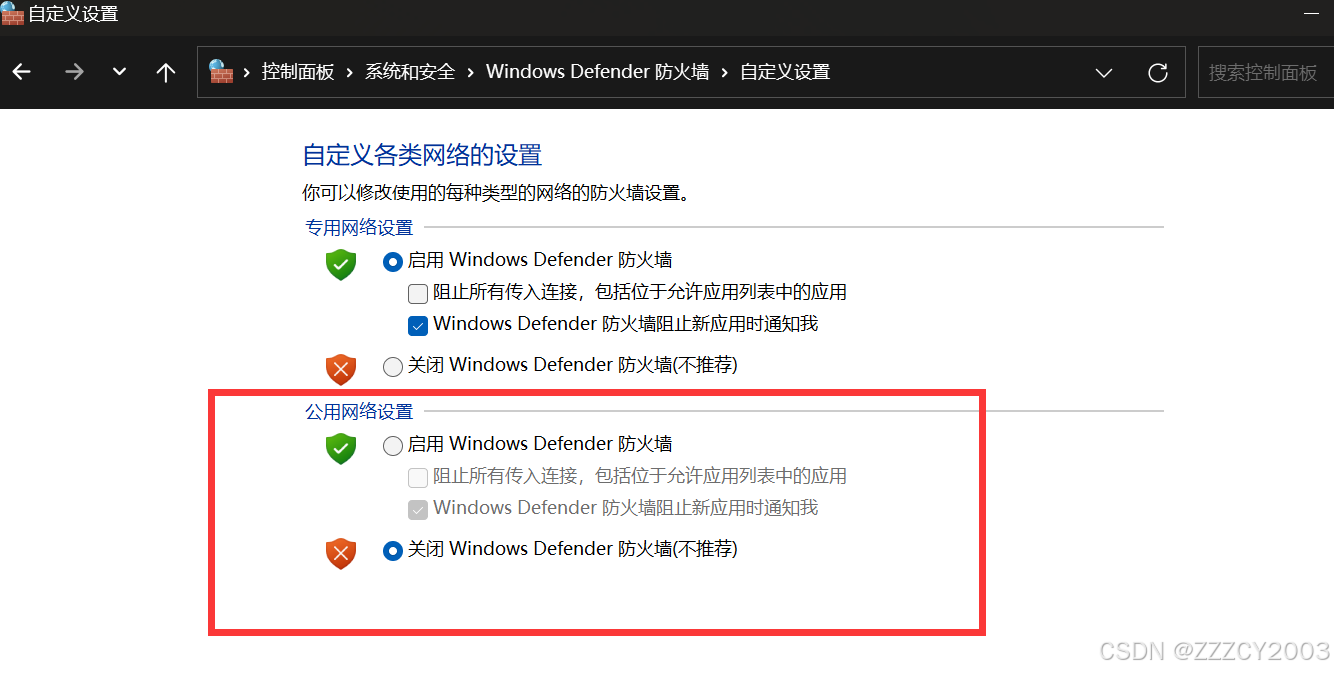 其实配置好了这个,有些电脑还是ping不通,这可能是物理机的防火墙在阻止ICMP请求。可以到控制面板找到防火墙设置,暂时关闭公用网络设置,就可以ping通了