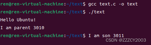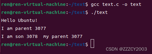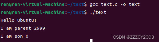 展开代码#include <stdio.h> #include <sys/types.h> #include <unistd.h> int main() { pid_t pid; printf("Hello Ubuntu!\n"); pid=fork(); if(pid<0) { return -1; }else if(pid==0)//son { printf("I am son %d\n",pid); }else { printf("I am parent %d\n",pid); } return 0; }