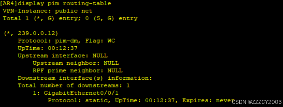 在AR1上以Loopback 0接口为源地址,向239.0.0.12发送ICMP数据包,模拟组播源,之后再4台路由器上查看PIM路由表