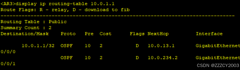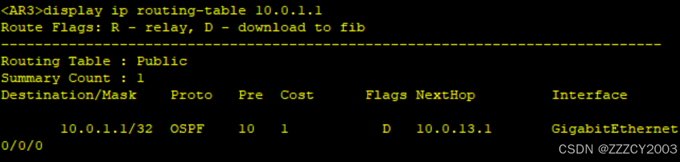 展开代码<AR3>display ip routing-table 10.0.1.1