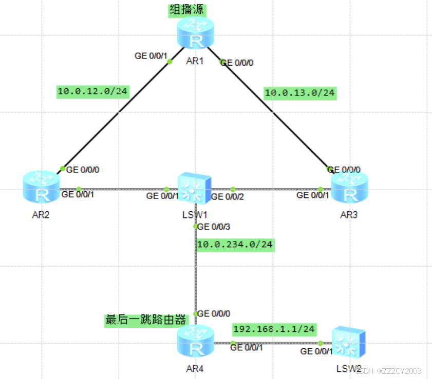 4台路由器之间运行OSPF路由协议,均创建Loopback0,IP地址为10.0.x.x/32。4台路由器之间构成一个组播网络,AR1作为第一跳路由器连接组播源239.0.0.12,AR4作为最后一跳路由器连接组播组239.0.0.12的接收者,为了能够让组播源的流量顺利被AR4上的组播组成员接收,在每台路由器上部署PIM-DM,并在AR4的GE0/0/1接收上激活IGMPv2