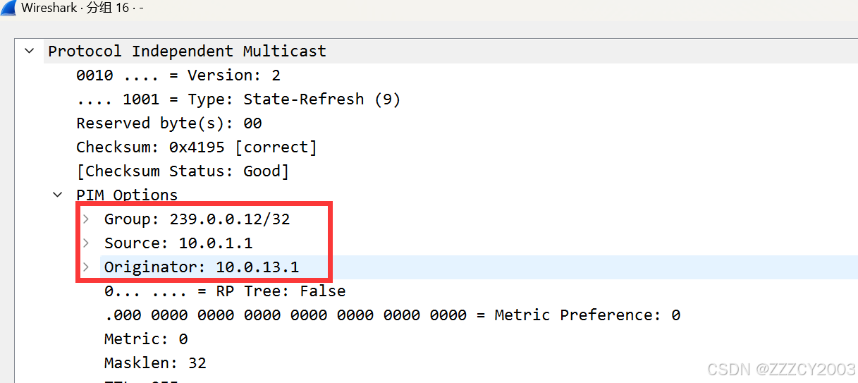 State-Refresh 报文中会携带组播源地址(10.0.1.1),组播组地址(239.0.0.12),下游设备 收到后会创建(S,G)表项,并继续向下游发送State-Refresh报文