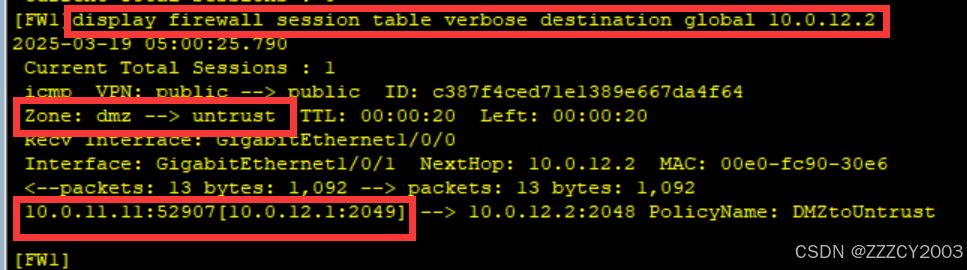 展开代码[FW1]display firewall session table verbose destination global 10.0.12.2