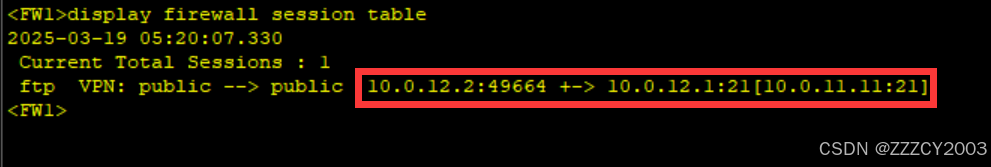 展开代码<FW1>display firewall server-map 2025-03-19 10:15:24.830 Current Total Server-map : 2 Type: Nat Server, ANY -> 10.0.12.1:21[10.0.11.11:21], Zone:---, protocol:tcp Vpn: public -> public Type: Nat Server Reverse, 10.0.11.11[10.0.12.1] -> ANY, Zone:---, protocol:tcp Vpn: public -> public, counter: 1