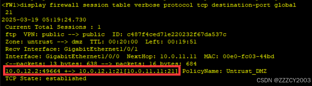 展开代码<FW1>display firewall session table verbose protocol tcp destination-port global 21