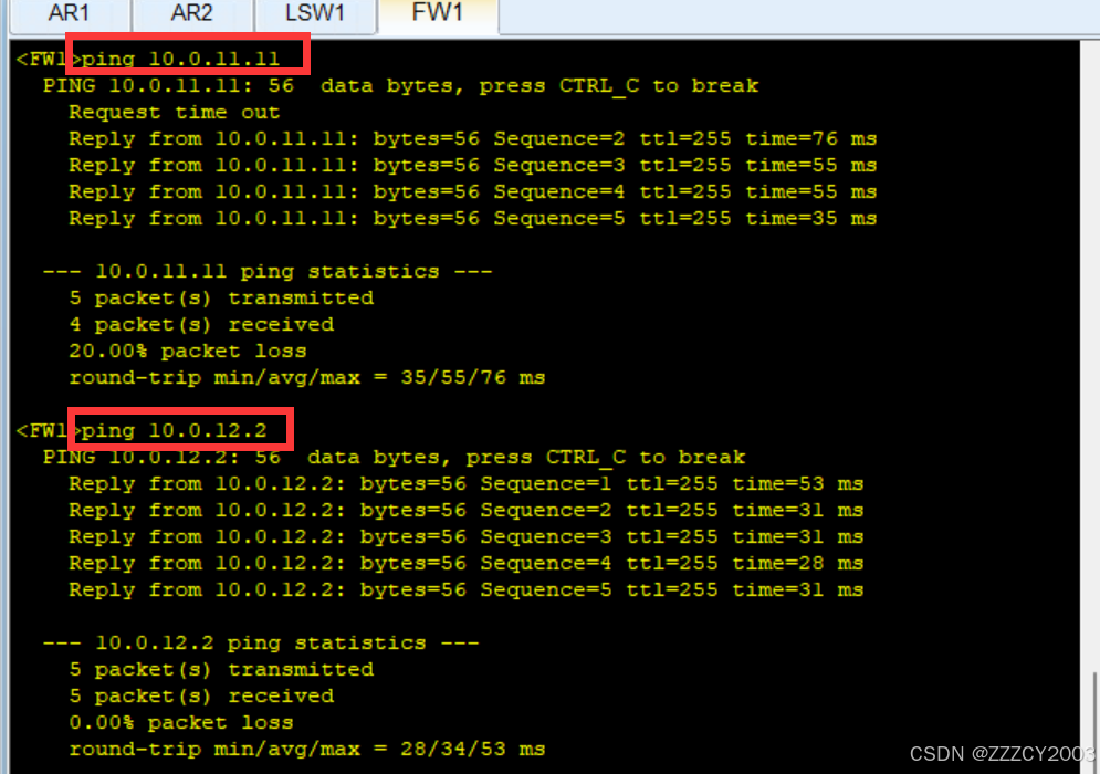 测试FW1与AR1、AR2之间的连通性