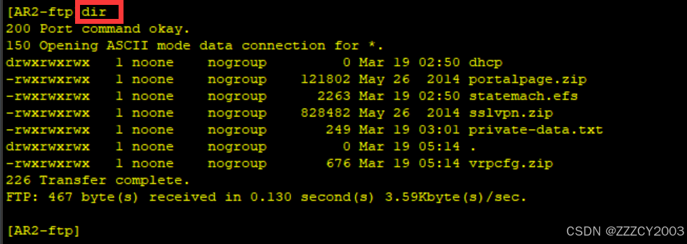 在AR1上开启FTP服务,AR2作为FTP客户端通过FW1映射出地址登录AR1的FTP服务,并执行命令dir查看文件列表,观察FW1的ASPF如何处理多通道协议