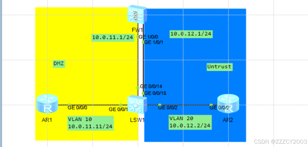 展开代码# LSW1配置 [LSW1]vlan batch 10 20 [LSW1]int vlan 10 [LSW1-vlan10] description DMZ [LSW1-vlan10] quit [LSW1]interface GigabitEthernet0/0/1 [LSW1-GigabitEthernet0/0/1] port link-type access [LSW1-GigabitEthernet0/0/1] port default vlan 10 [LSW1-GigabitEthernet0/0/1] quit [LSW1]interface GigabitEthernet0/0/14 [LSW1-GigabitEthernet0/0/14] port link-type access [LSW1-GigabitEthernet0/0/14] port default vlan 10 [LSW1-GigabitEthernet0/0/14] quit [LSW1]int vlan 20 [LSW1-vlan20] description Untrust [LSW1-vlan20] quit [LSW1]interface GigabitEthernet0/0/2 [LSW1-GigabitEthernet0/0/2] port link-type access [LSW1-GigabitEthernet0/0/2] port default vlan 20 [LSW1-GigabitEthernet0/0/2] quit [LSW1]interface GigabitEthernet0/0/15 [LSW1-GigabitEthernet0/0/15] port link-type access [LSW1-GigabitEthernet0/0/15] port default vlan 20 [LSW1-GigabitEthernet0/0/15] quit # AR1配置 [AR1]int g0/0/0 [AR1-GigabitEthernet0/0/0]ip address 10.0.11.11 24 [AR1-GigabitEthernet0/0/0]q [AR1]ip route-static 0.0.0.0 0.0.0.0 10.0.11.1 # 配置用于访问Internet的默认路由 # AR2配置 [AR2]int g0/0/0 [AR2-GigabitEthernet0/0/0]ip address 10.0.12.2 24 [AR2-GigabitEthernet0/0/0]q